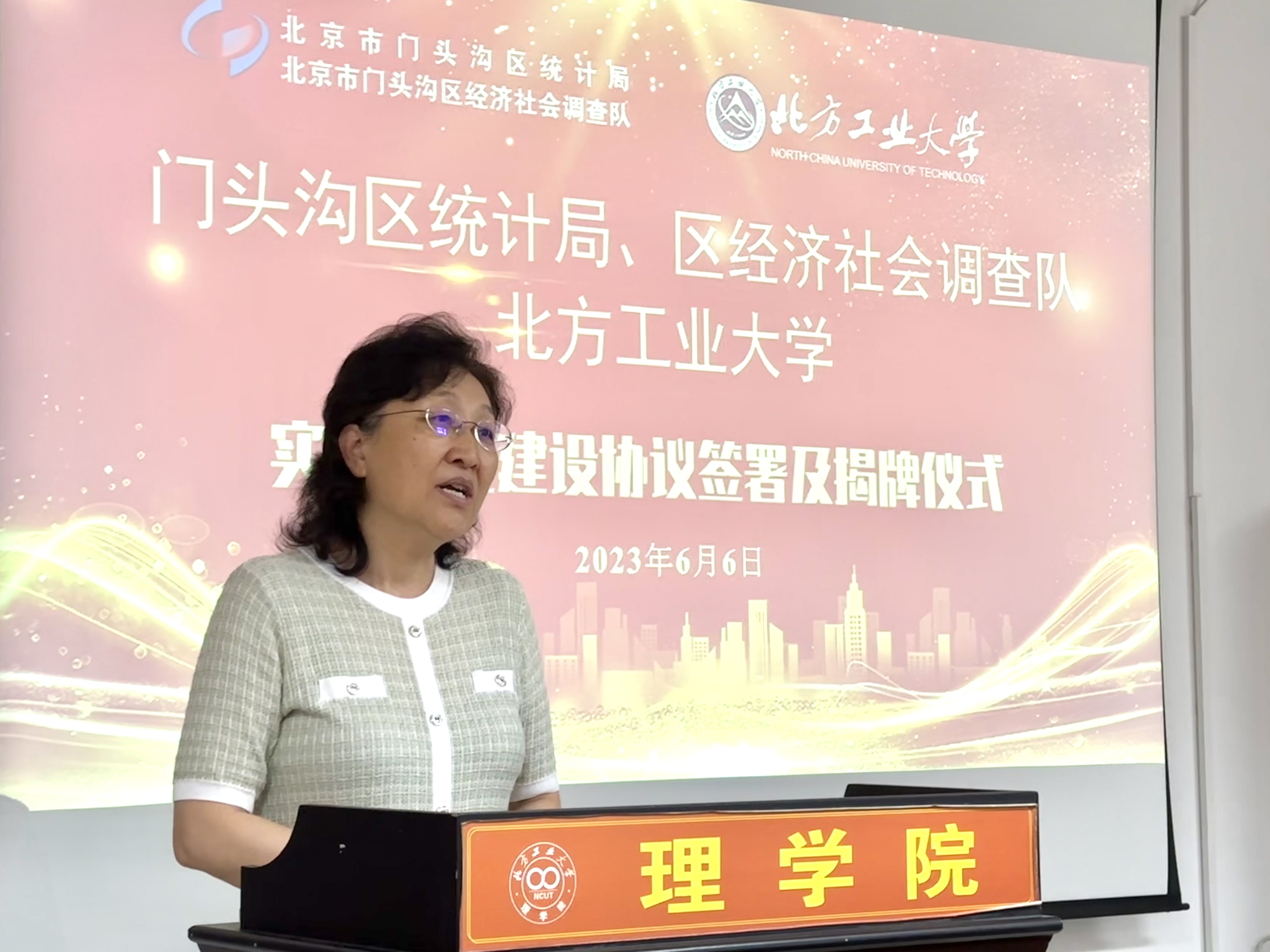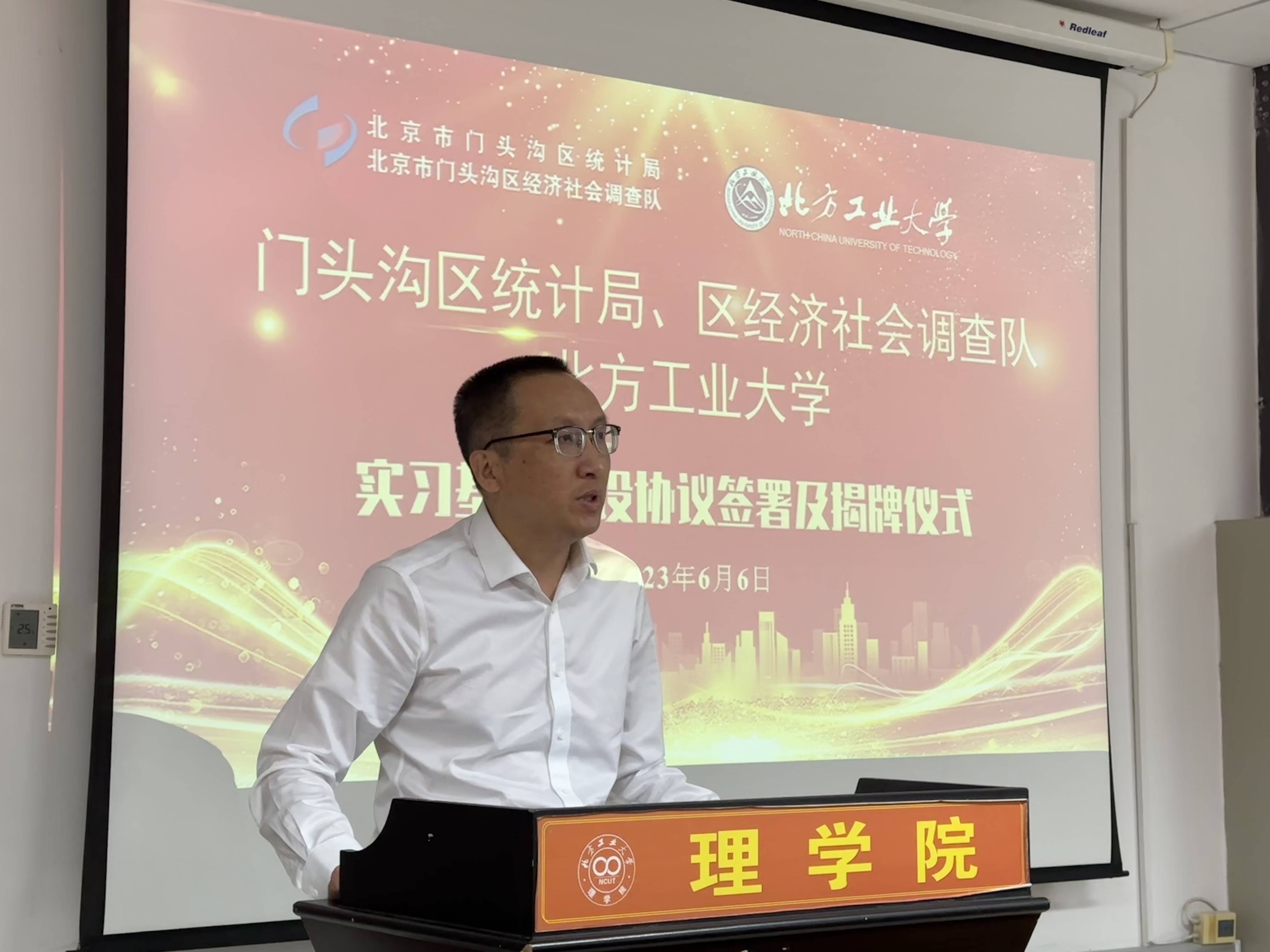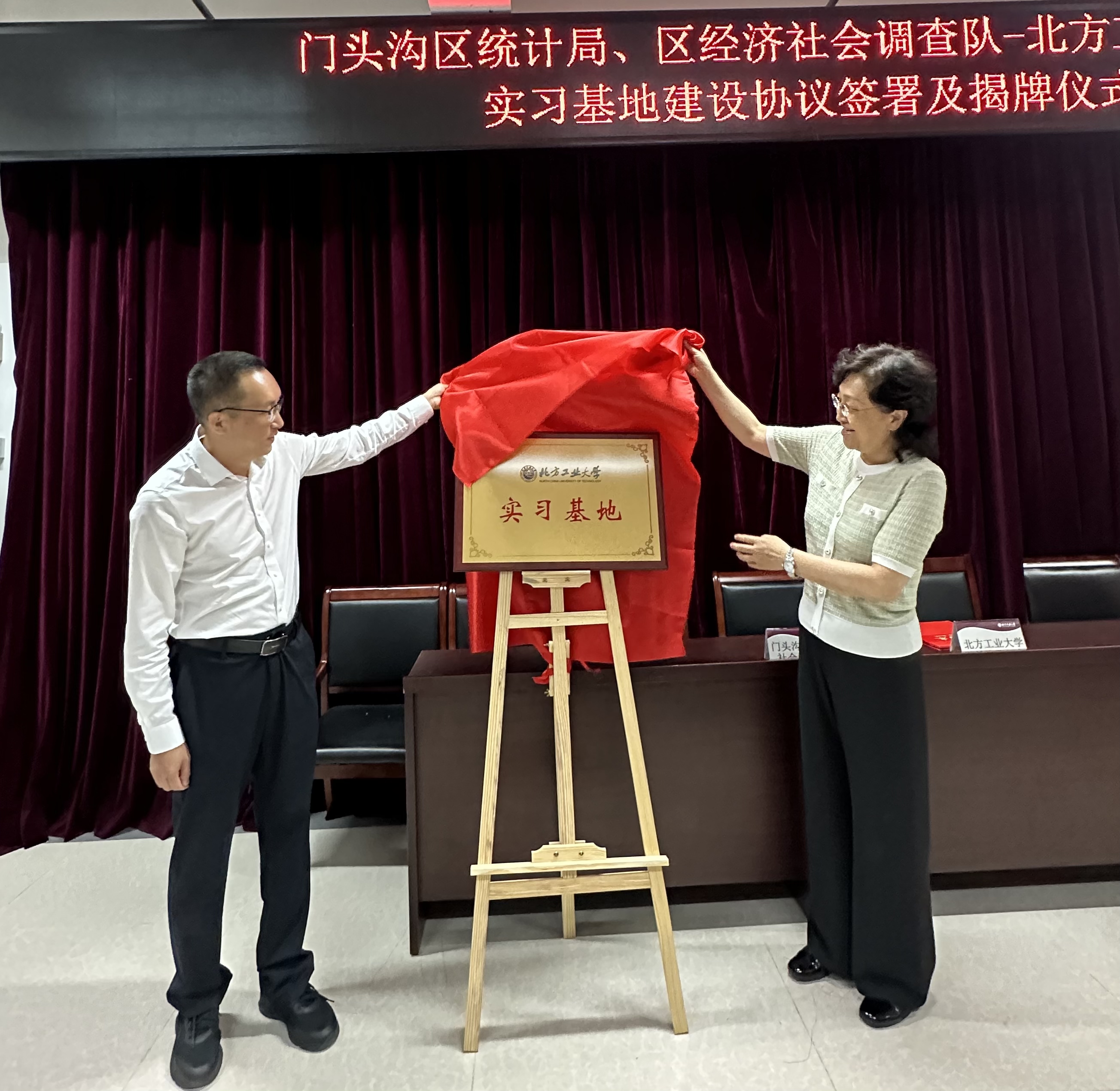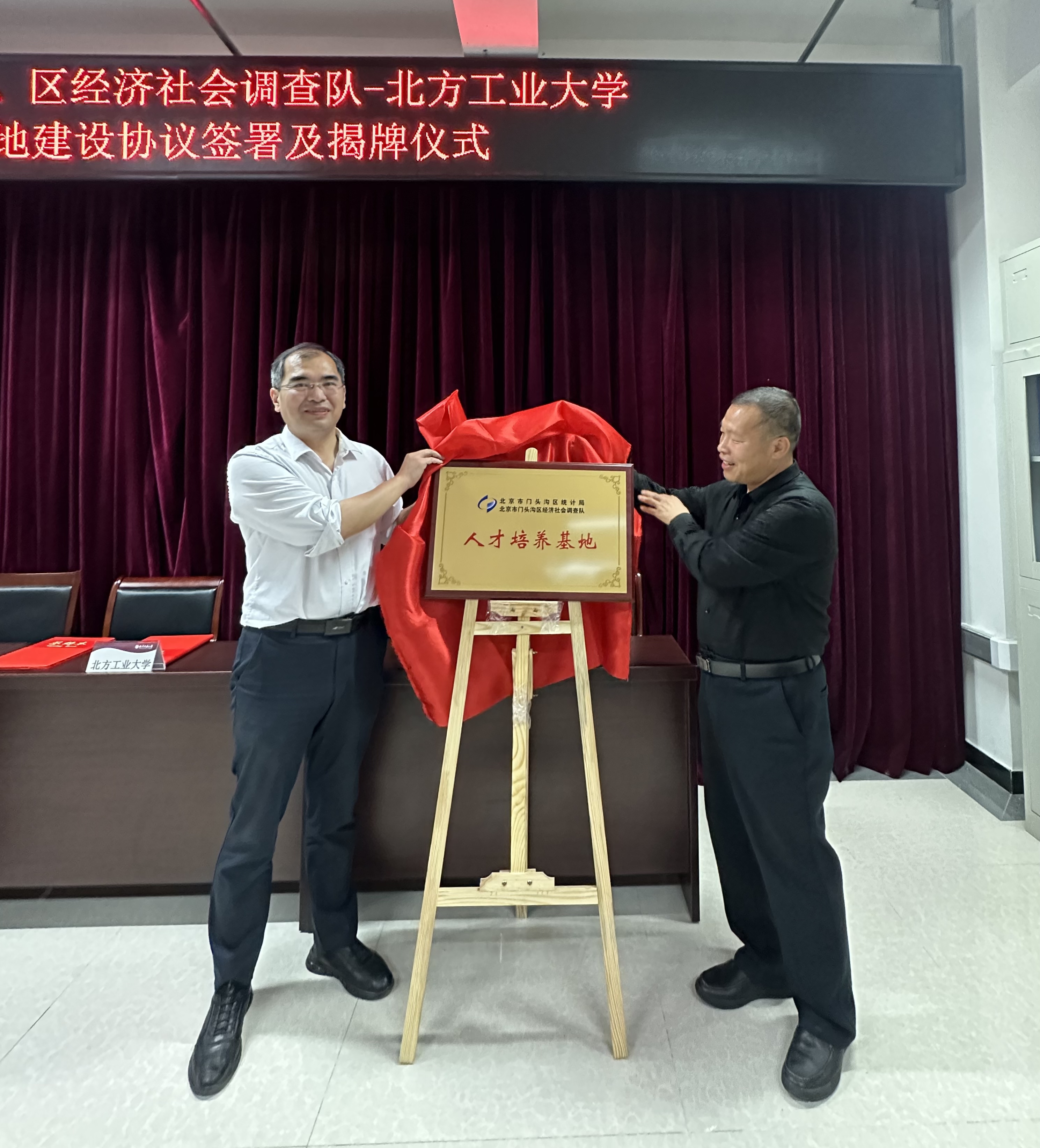 6月6日下午,北京市门头沟区统计局党组书记、局长谢晓东,北京市门头沟区统计局党组副书记、调查队队长宋长江、北京市门头沟区统计局党组成员、三级调研员王荣敏等一行15人莅临今年会,与今年会共商区校合作,携手发展事宜,双方共同签署了校外实习基地建设协议,并举行了实习基地揭牌仪式。今年会党委常委、副校长栗苹,今年会官网班子成员、统计学系全体教师参加了仪式。仪式由今年会官网党委副书记、院长李冱岸主持。