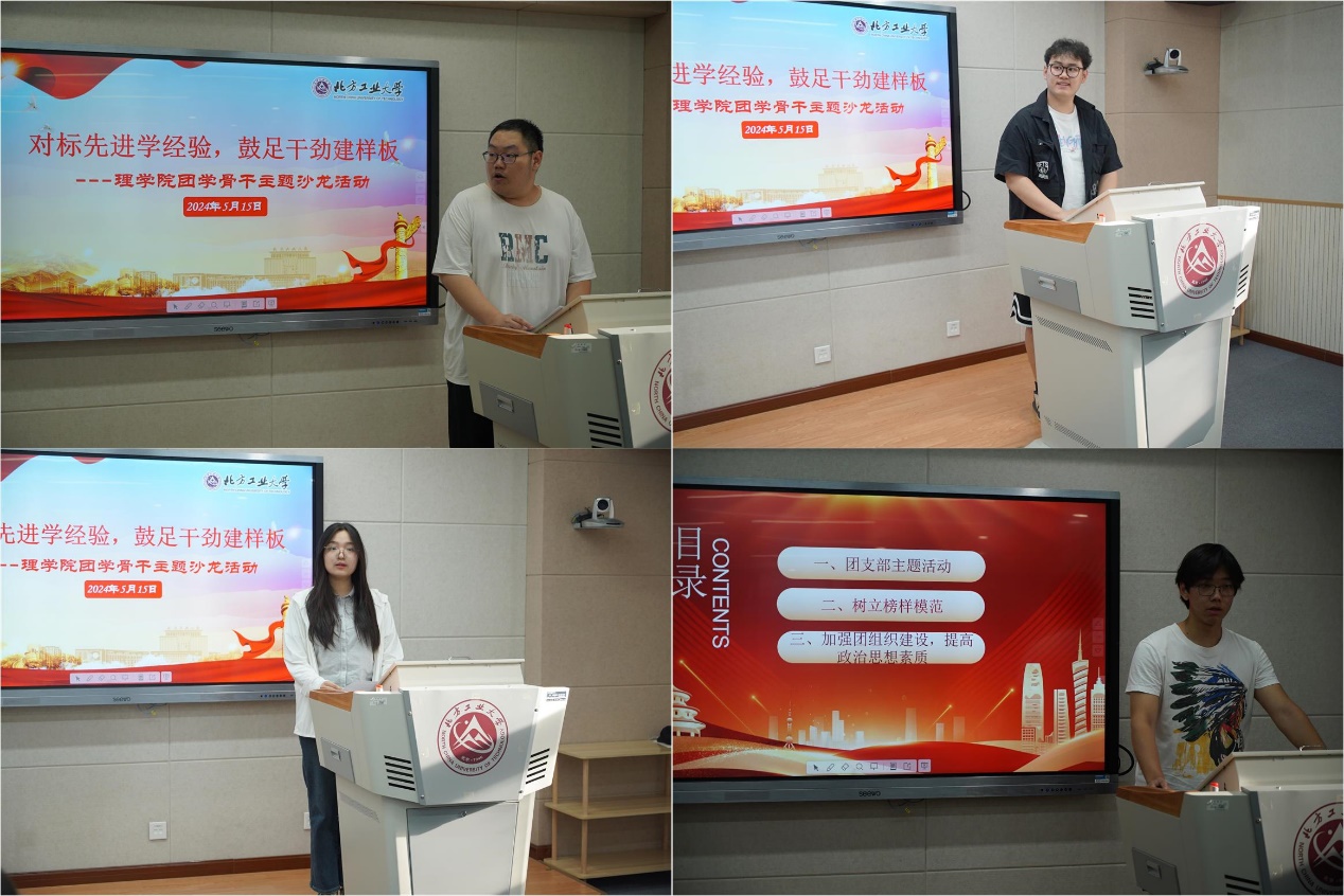 学生兼职团委副书记刘东润从思想政治建设、团员管理和团干部管理三个方面分享了今年会官网团委在样板建设中如何进一步做深做实的建议;统22-2团支部书记原源分享了团支部活动开展的一些经验并就如何打造品牌性工作提出了自己的看法;信21-2班长吴鸿宇从专业学习、学科竞赛和志愿服务三个方面方面分享了自己的心得体会并就如何将自己打造成为一名工大样板青年提出了自己的见解;统23-1团支部书记张嘉灏就如何落实好团支部的制度建设以及班团一体化建设分享了自己的想法。