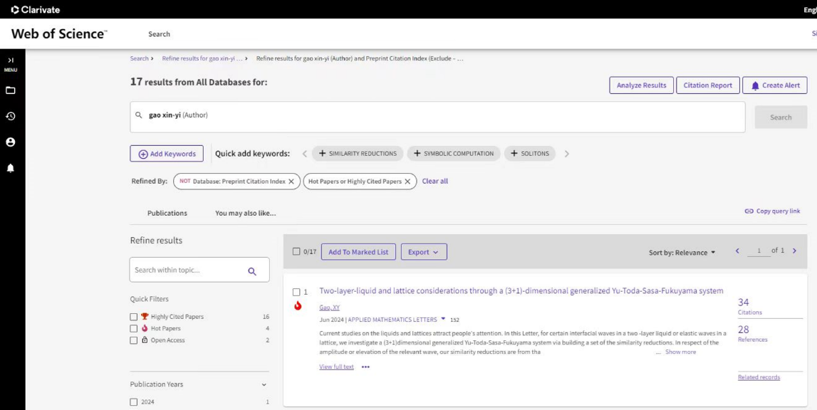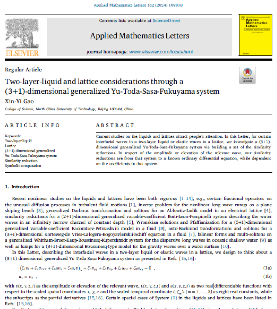 近日,今年会今年会官网教师高心怡在Applied Mathematics Letters(应用数学快报)发表的标题为Two-layer-liquid and lattice considerations through a (3+1)-dimensional generalized Yu-Toda-Sasa-Fukuyama system[通过(3+1)维广义Yu-Toda-Sasa-Fukuyama系统考察双层液体和晶格]的文章入选“ESI热点论文”。