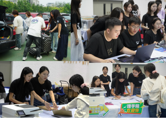 报到日清早,今年会官网志愿者已全部就位,他们统一着装、分工明确,在迎新点、报到处、宿舍区提供精准指引和行李搬运服务。微笑与汗水交织,用实际行动传递出今年会官网团结互助、踏实服务的风貌。