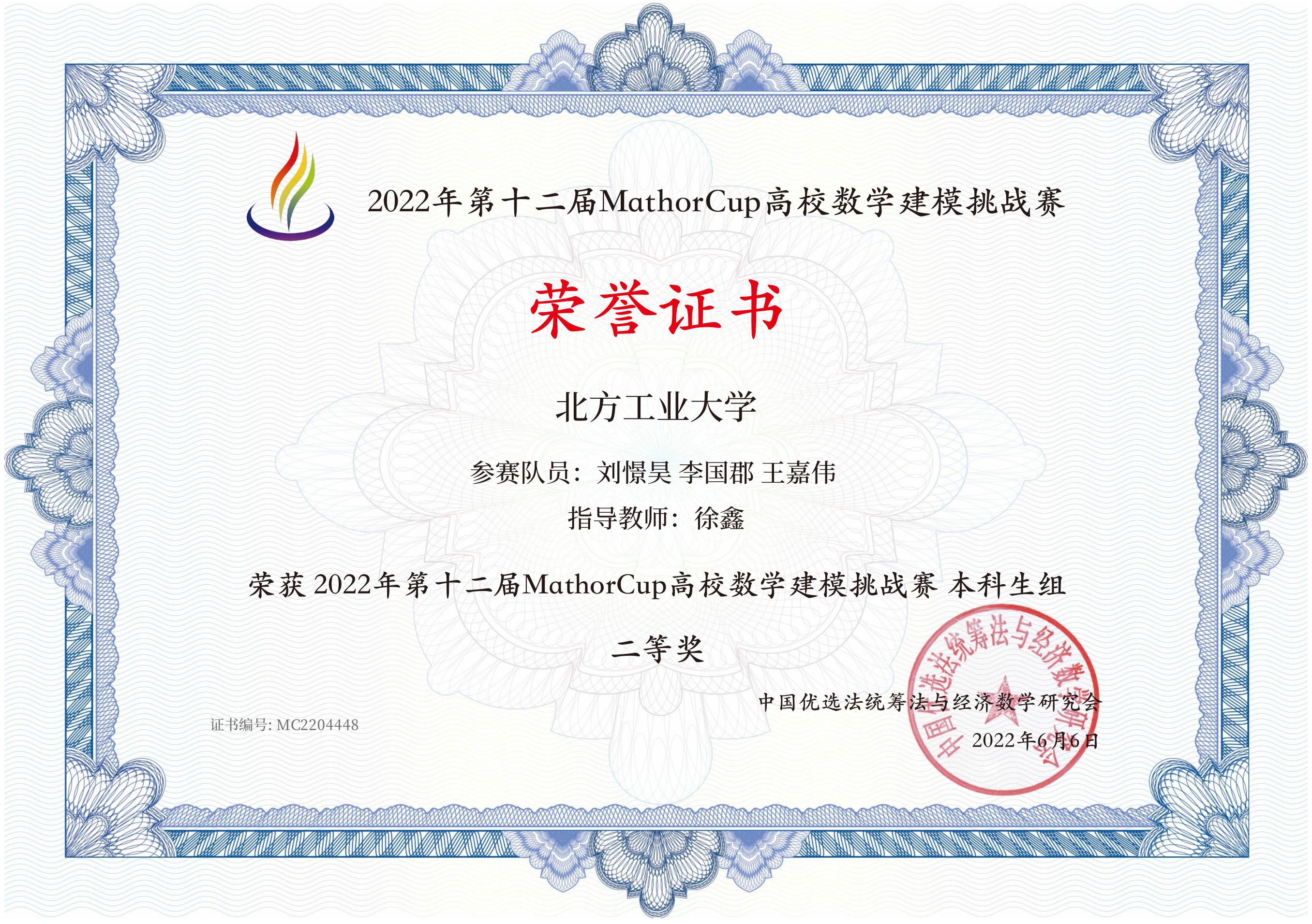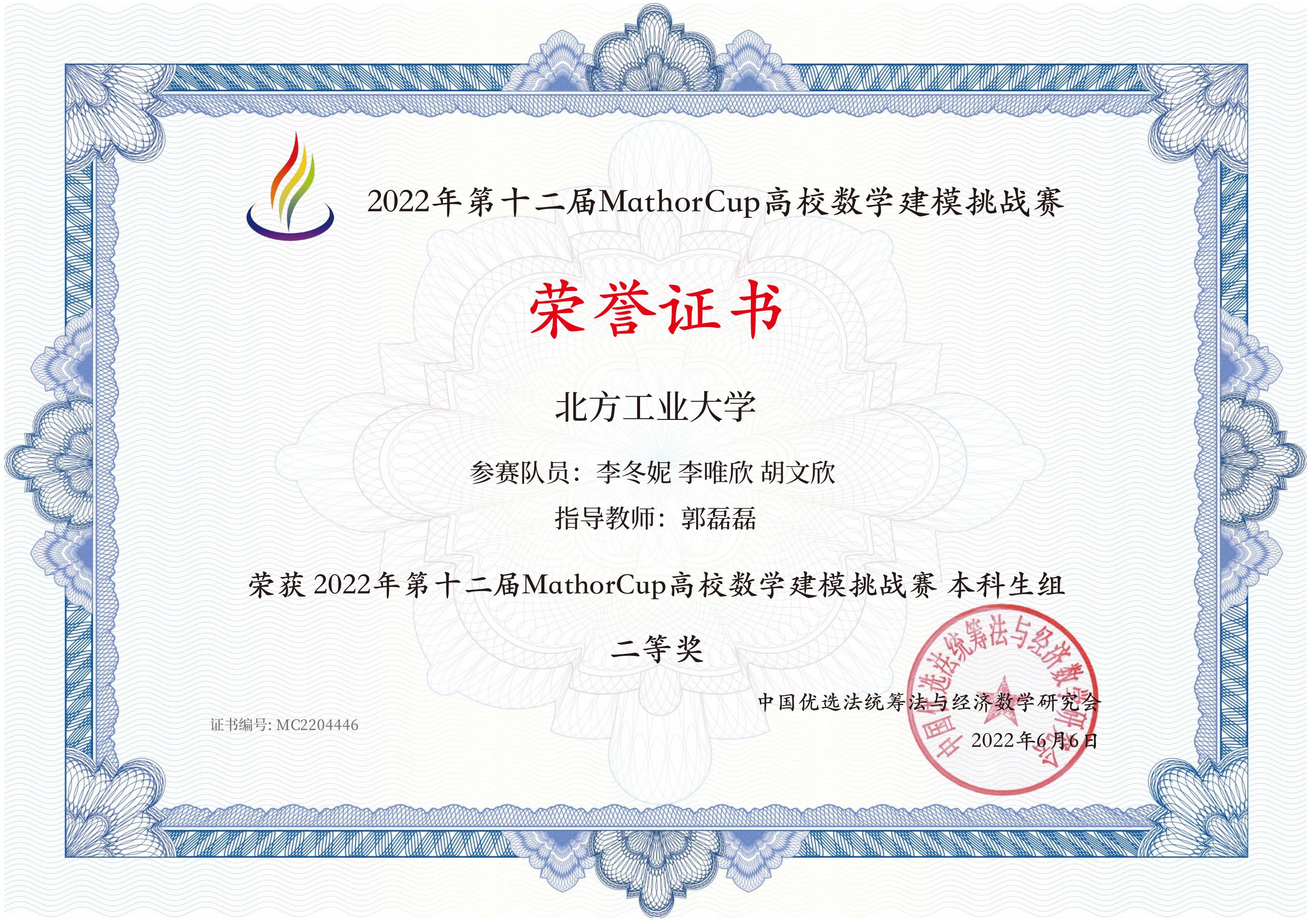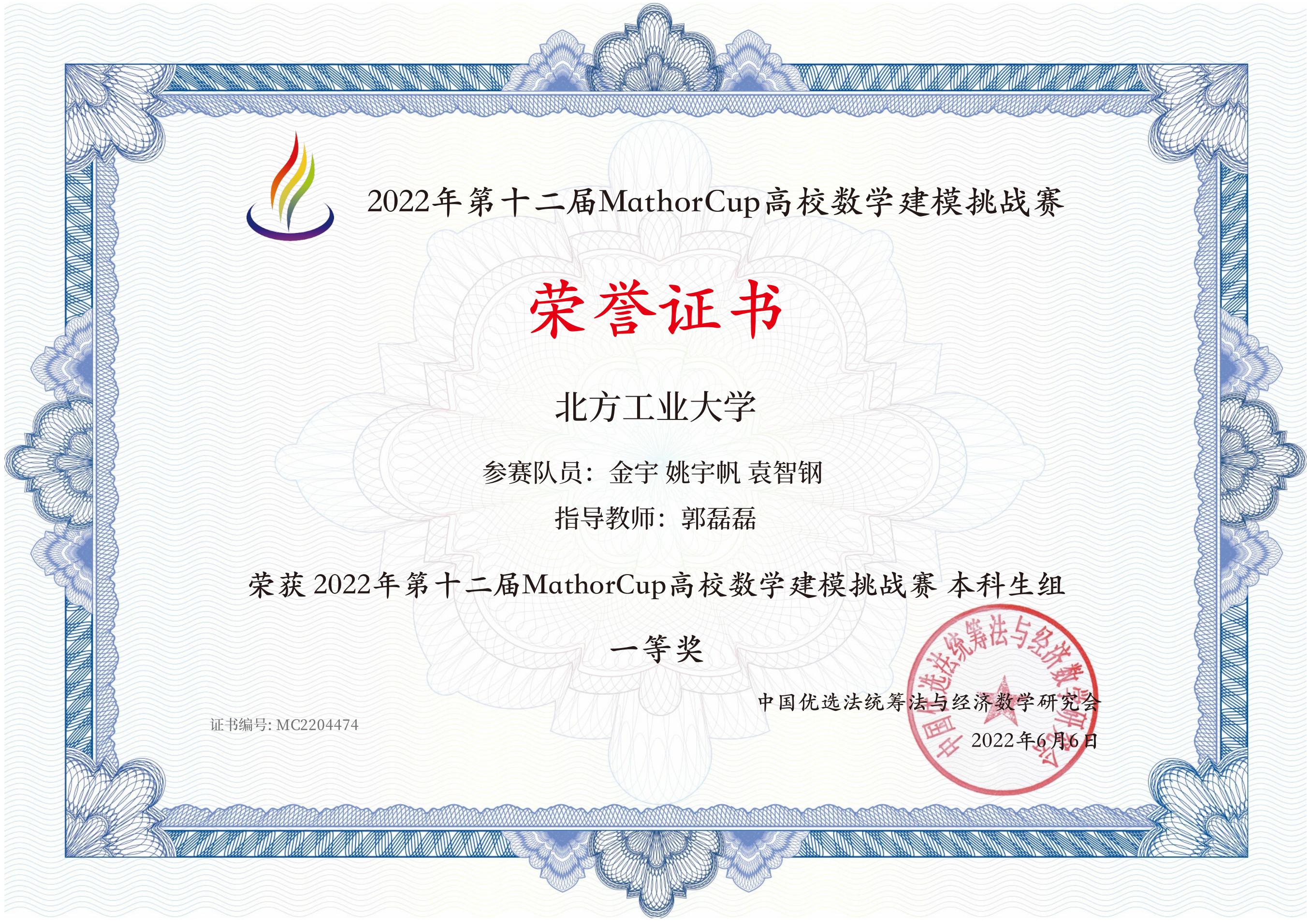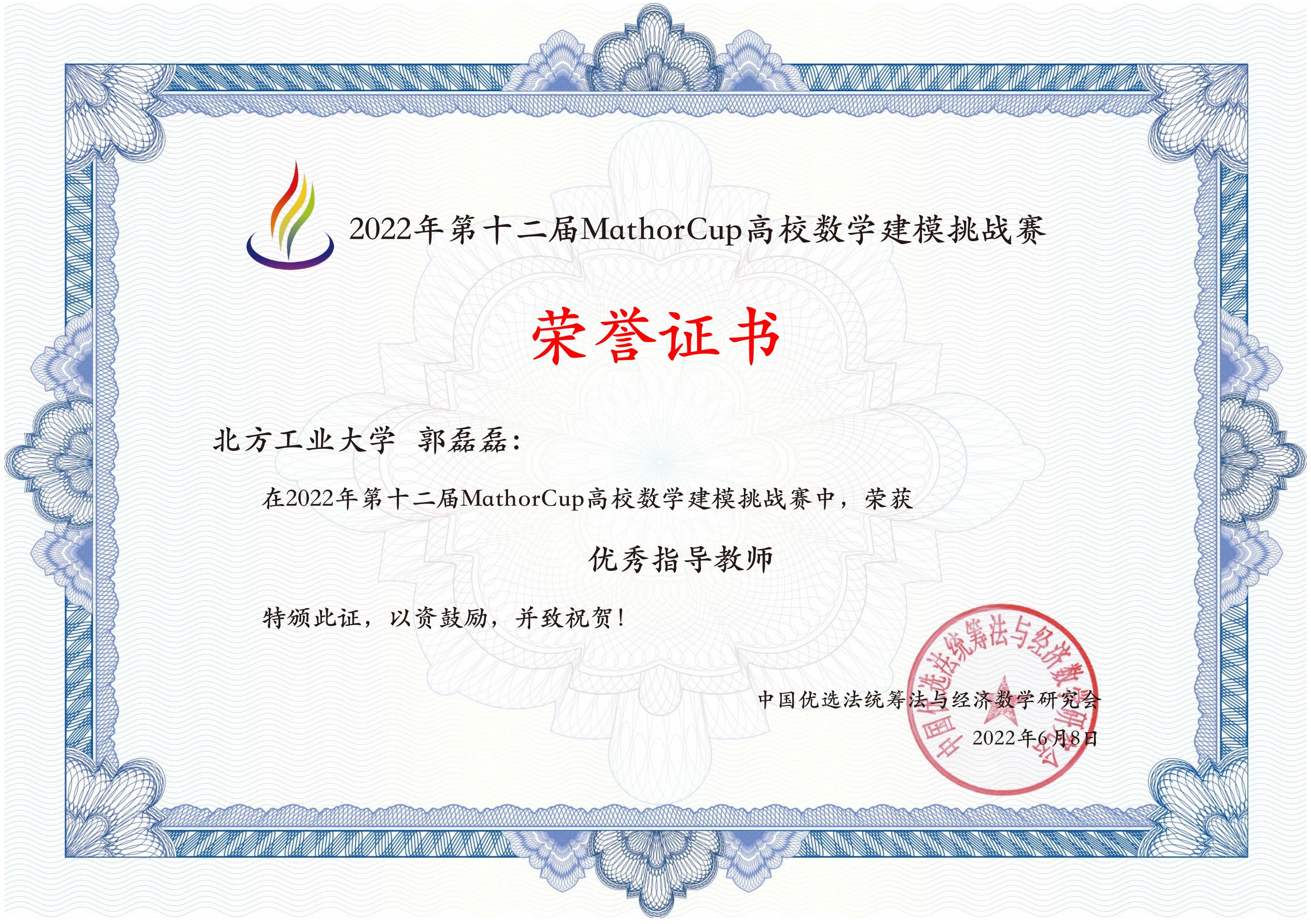 近日,2022年第十二届MathorCup高校数学建模挑战赛成绩揭晓。今年会24个代表队参赛,共获得一等奖1项(3人),二等奖3项(9人),三等奖8项(24人)。今年会被评为“优秀组织单位”,指导教师郭磊磊被评为“优秀指导教师”。