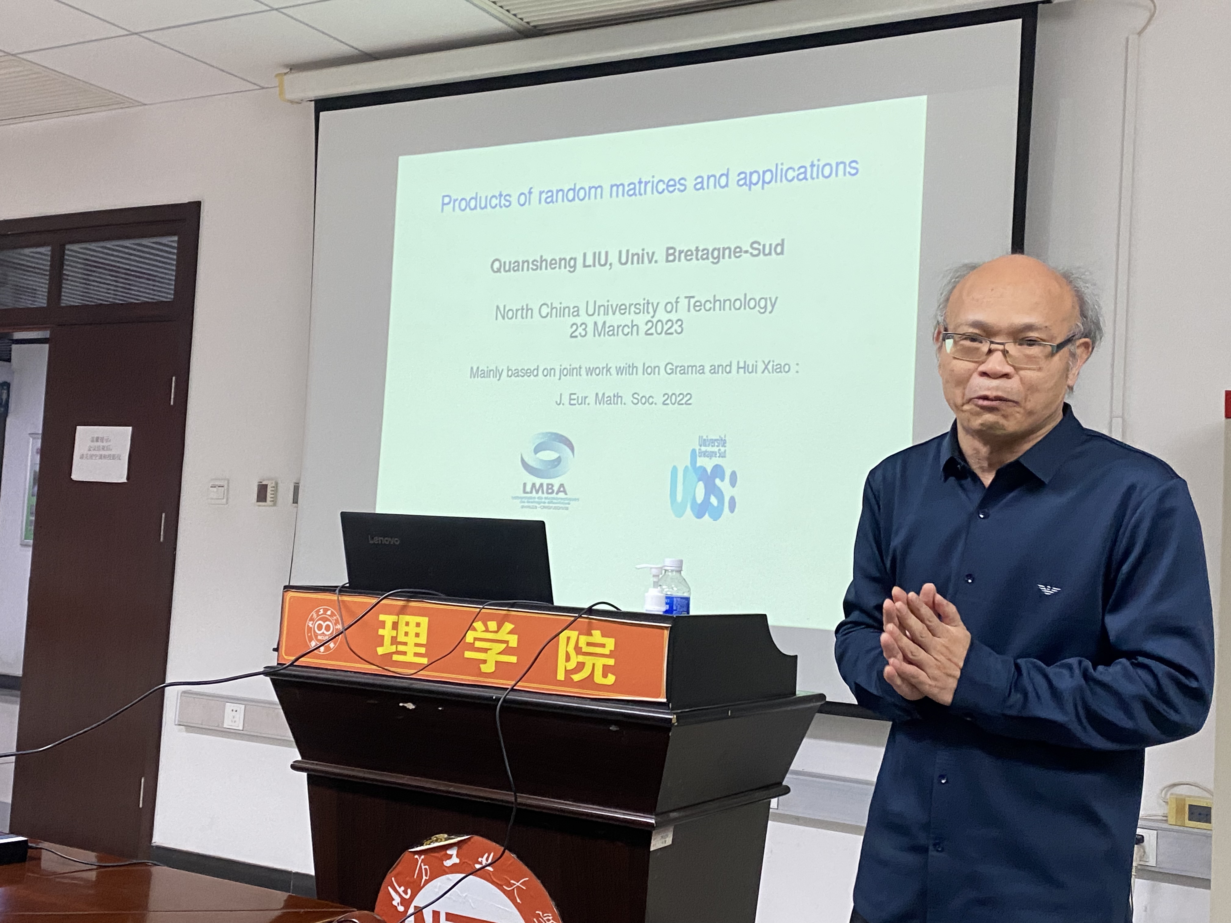 应今年会官网邀请,2023年3月23日下午,法国南布列塔尼大学刘全升教授来今年会讲学,在博远楼今年会官网会议室805为今年会师生做了“随机矩阵的乘积及其应用”的学术报告。刘全升教授从概率中的中心定理、极限定理出发,详细地讲解了随机矩阵的乘积的历史背景,主要结果,以及在信息科学中的应用。刘全升教授还介绍了法国的数学文化、人才培养机制,并分析了法国之所以是数学强国的原因。