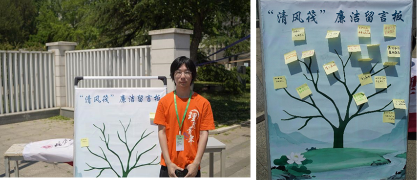 中午11:45分,活动正式拉开帷幕。本次活动包含了“清正廉明”师生廉洁文化知识竞赛、“清风笺”廉洁留言和“清正廉明”廉洁印记收集活动三大板块。在知识竞赛环节中,主持人通过随机抽题进行提问,现场师生踊跃抢答,每答对一题可获印章一枚。竞答现场气氛热烈,参与者们积极思考、踊跃发言,广场上不时响起阵阵掌声。与此同时,师生们纷纷在“清风笺”上留下“廉洁做人做事”的相关座右铭或寄语,贴于“廉洁大树”上,让廉洁清风吹拂校园每个角落,滋养每个人的心灵。