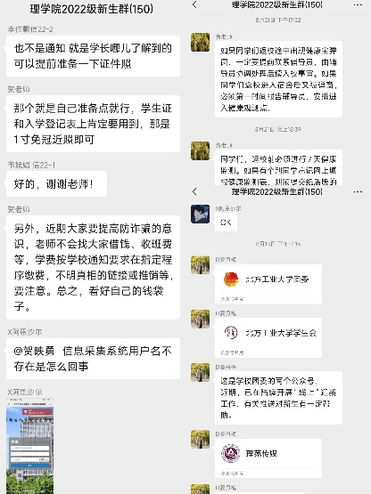 自八月上旬开始,为保证2022级迎新工作的顺利开展,学院新生辅导员、班导师与小辅导员们提前建立2022级新生QQ群、微信群,通过网络“牵线”,帮助22级的“萌新”们尽早融入大学。学院党委副书记、班导师、辅导员、小辅导员们在新生年级群、班级群里细致讲解疫情防控要求规定、入学报到流程、绿色通道办理、统计新生各类信息、解答新生各类问题。针对新生们关心的学习、工作、生活中的各类疑问,学院团委及时在学院团委公众号“理苑传媒”发布“今年会官网专业概况”、“新生心中不解之谜的答案”、“校园卡、校园网的使用”、“北方工大的美食攻略” 四期推送,从而快速帮助新生了解大学、融入大学。